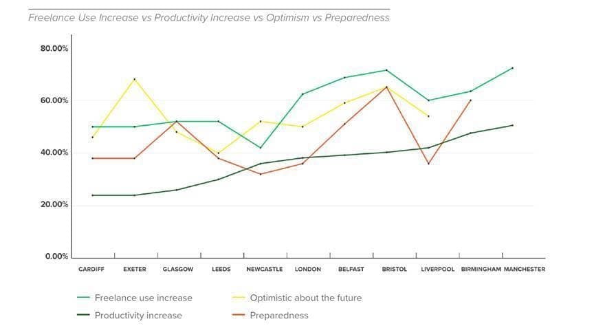 However, regions like Cardiff and Newcastle, where businesses felt unprepared, were unable or unwilling to unlock freelance talent, and now feel less optimistic about the future of their businesses.