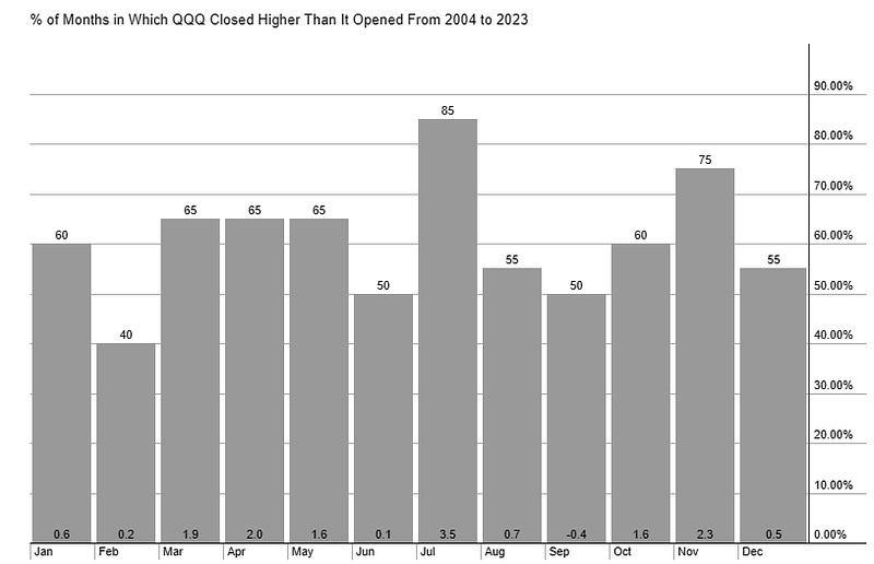 The following chart from StockCharts shows how QQQ has performed by month over the last 20 years. The number at the bottom of the column is the average gain or loss. The number at the top of the column is how often (%) the index has closed higher over the time frame in that month.