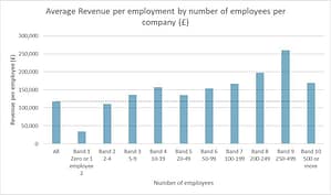 Immediately apparent from this data is the steady increase in revenue per employee up to Band Four, which represents businesses with 10-19 employees. This is a range where SMEs can be most productive and generate more revenue per employee than their larger counterparts in Bands 5-7.
