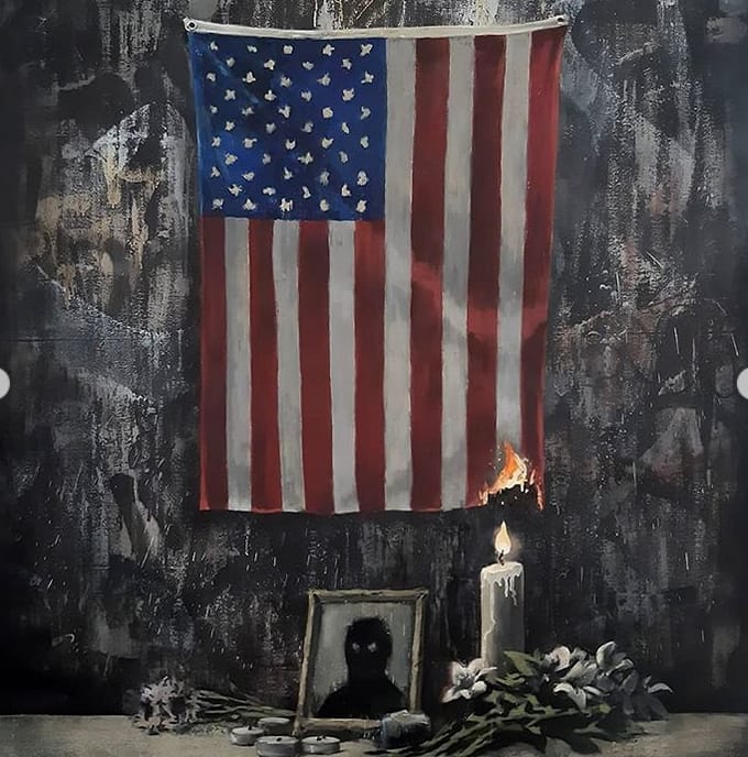 On his Instagram post a painting of a vigil candle can be seen burning the American flag, with an image of a black person in a picture.
