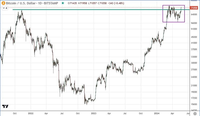 “In 2020, upon nearing the 2017 all-time high, the price chopped around for a month before continuing higher. In 2024 we’ve been hovering near 2021 high of $69,000 for two and a half months