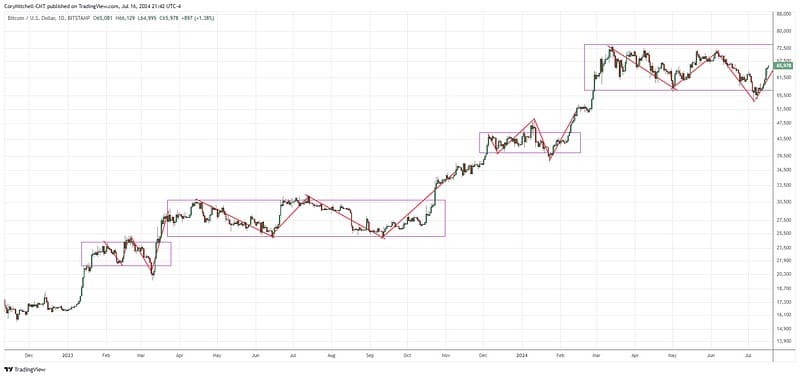 Cory Mitchell, an analyst with Tradequotex.com said, “Bitcoin has formed this same pattern repeatedly over the last year and a half, and it is a common pattern across bull markets in all assets.