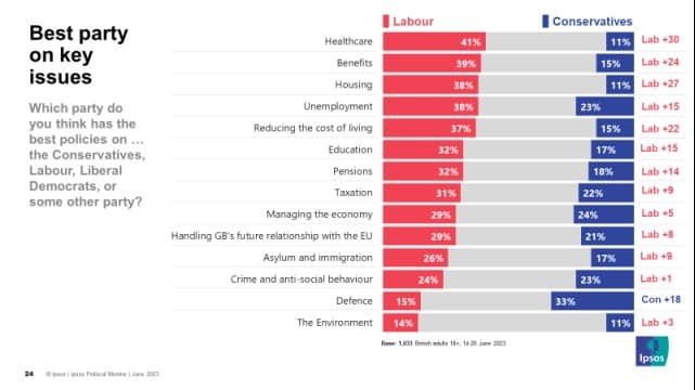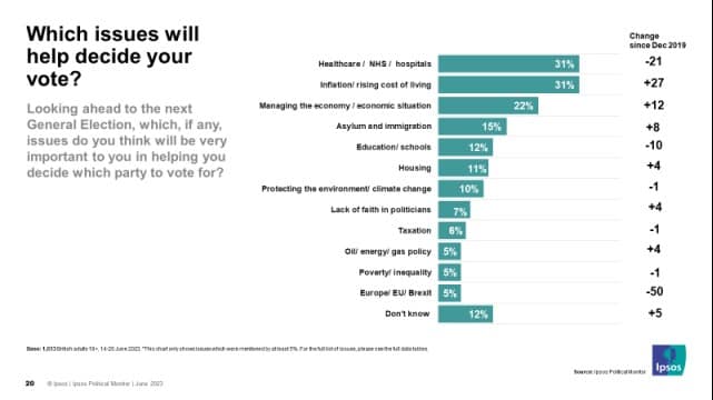 The latest Ipsos Political Monitor, taken 14th to 20th June 2023 asked the public about the key issues that would impact their vote at the next General Election and which party had the best policies to deal with them.