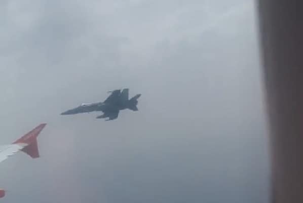Following the hoax bomb threat a Spanish fighter jet was scrambled and footage shows the moment the pilot was tipping the wings ordering the easyJet pilot to “follow me.”