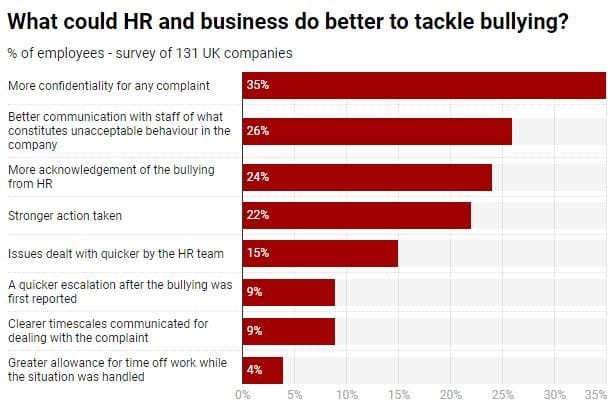 35% of respondents who have been bullied in the workplace said that a greater amount of confidentiality should have been upheld throughout the handling of the issue. 26% felt that better communication was needed from the company on what constitutes unacceptable behaviour in the workplace.