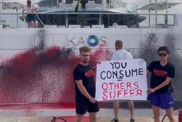 Eco-activists sprayed red paint using fire extinguishers on a £228 million mega yacht in Ibiza owned by Walmart heiress Nancy Walton.