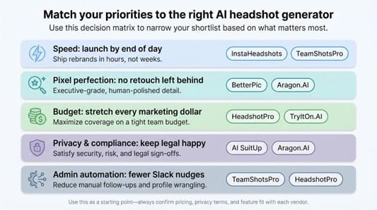 If your rebrand deadline is this Friday, every minute matters. InstaHeadshots finishes in roughly fifteen minutes per person, followed by TeamShotsPro’s one-minute proofs for LinkedIn. Either option turns raw selfies into usable assets before lunch.