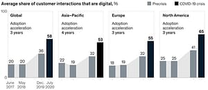 As McKinsey data shows, the share of customer interactions that were digital jumped more than 20% globally, with some continents like Asia-Pacific experiencing digital adoption acceleration by as much as four years.