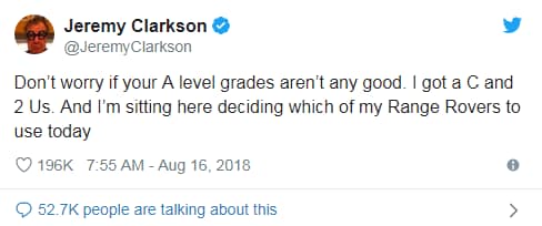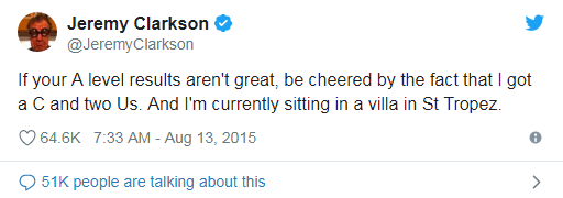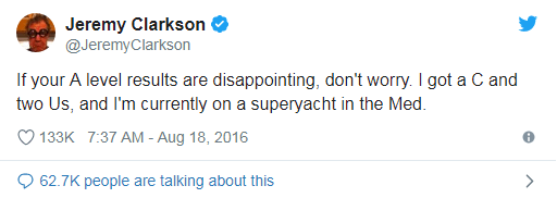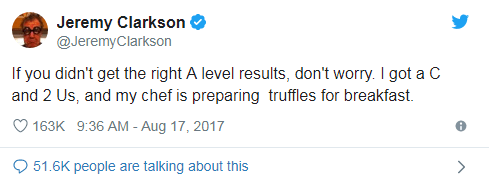 He is of course also the king of the A-Level results day tweets. While we wait to see what gem Clarkson comes up with this year, here’s been the pick of the bunch from recent years: