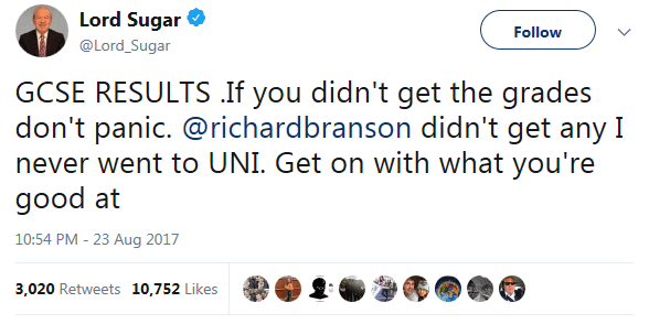 As Sugar mentioned, the Virgin boss today has a net worth of over $5bn, but last year, used GCSE results day to highlight his struggles at school, where he had a poor academic performance.