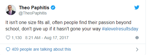 While Meaden hasn’t (yet) taken to social media to share her ‘don’t stress over your exam results’ story, fellow Dragon Theo Paphitis gave some reassuring advice to students two years ago.