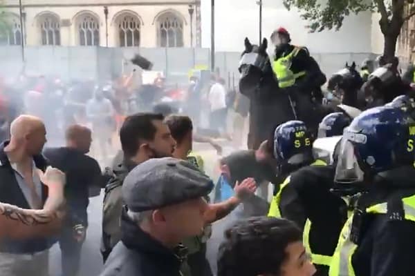 Far-right hooligans have violently clashed with riot police at Trafalgar Square who were seen shouting, punching and kicking officers.