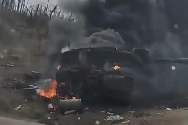 A video has now emerged showing a Challenger 2 destroyed and burning with thick black smoke billowing from it and it is not known if the crew survived.