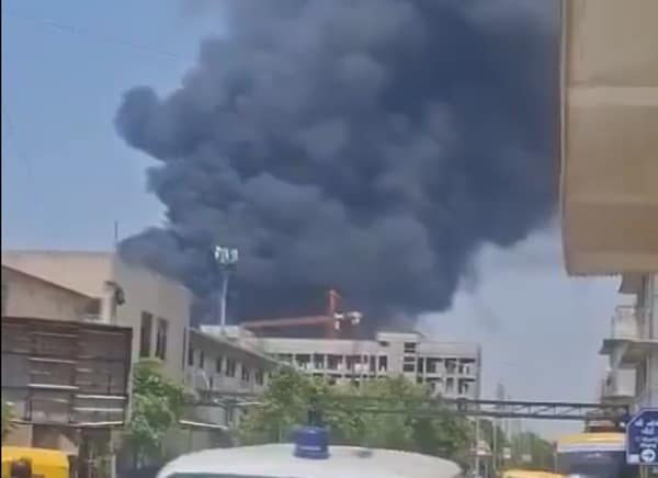 Footage shows what appears to be an apartment building on fire and there is thick black smoke rising into the sky at the airport.