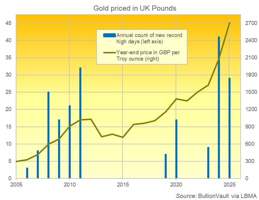 Gold priced in the UK Pound topped £2700 per Troy ounce for the first time ever on Tuesday, rising 24.5% since the start of 2025 and recording its 29th new all-time high of the year so far.