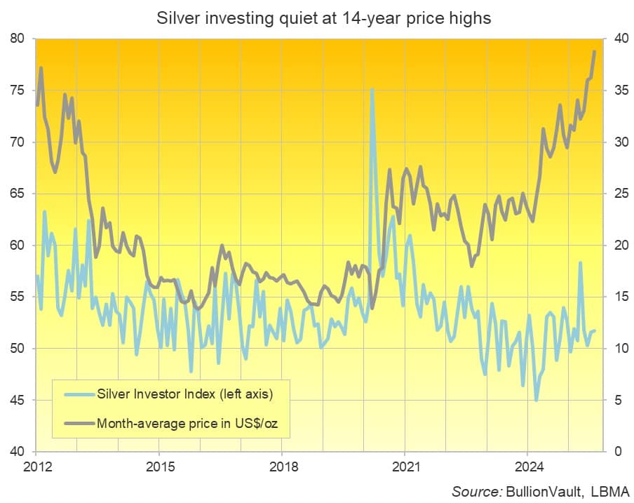 Silver investing also remained quiet net-net in August as the more industrially-useful precious metal rose towards this week’s fresh 14-year highs above $40 per Troy ounce.