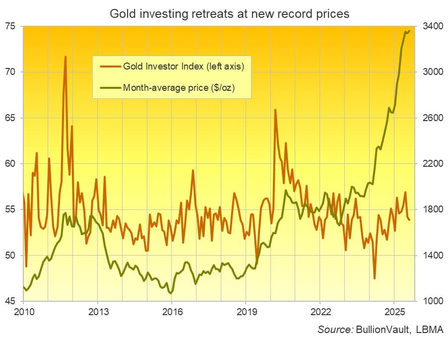 Any reading above 50.0 signals more buyers than sellers across the month. The Gold Investor Index set a series low of 47.5 on heavy profit-taking in March 2024, hitting its highest in four years at 56.9 this June.