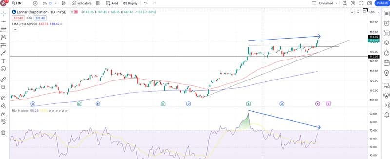 However, looking at the arrows, overseeing the price action, and the relative strength index (RSI) indicator, LEN might be in for a correction. The RSI hints at a bearish divergence or weakening momentum in the mid-term, which could allow new buyers to take positions in Lennar at levels closer to $145.