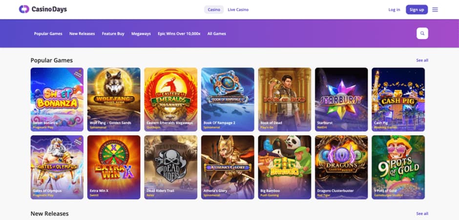 Cashback Offer: CasinoDays is known for its frequent cashback promotions. Players can receive a percentage of their net losses back, which is usually credited as bonus funds with low wagering requirements. The substantial match deposit bonus and no-deposit free spins make CasinoDays an appealing choice for both new and seasoned players.