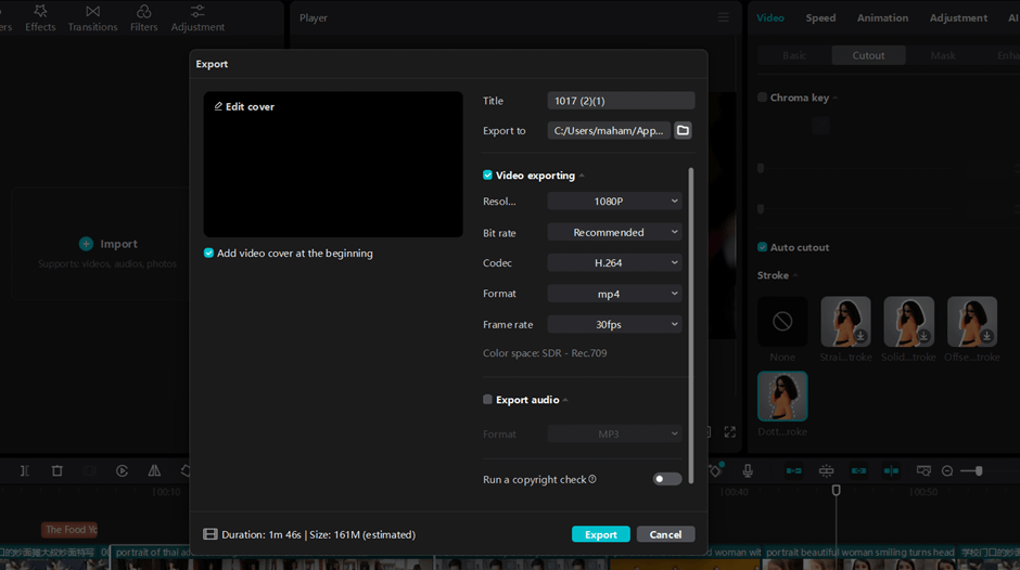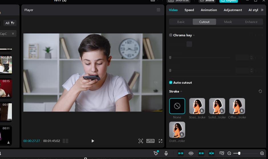 Now you can remove a video’s background by clicking on the cutout button on the right side options under the video tab. You can also choose the auto cutout options to remove the background of your video. This video background remover tool also offers some stock styles that you can apply to remove the background of your video professionally.