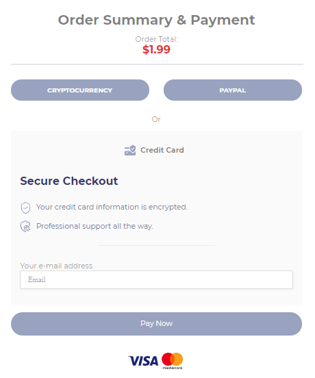 You can pay either by Cryptocurrency, PayPal or Credit card.