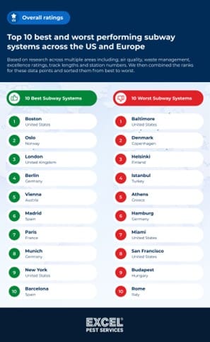In Europe, Rome’s metro system is the poorest rated with just 6% of responses coming in as ‘Excellent’. Lille and Stockholm make up the bottom three with 24% of 5 star reviews for each.