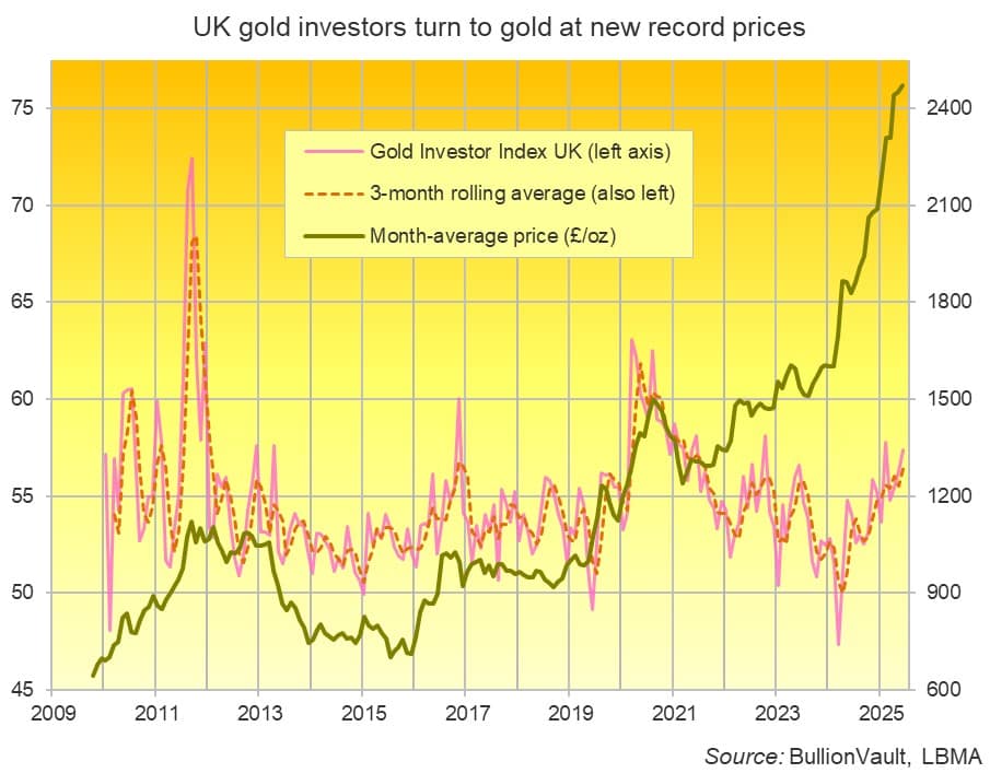 A reading of 50.0 on the Gold Investor Index would signal a perfect balance between the number of buyers and sellers. This unique measure of gold investing sentiment set a decade high on its UK series at 63.1 as the Covid pandemic took hold in March 2020, and it set a record low of 47.3 on heavy profit-taking by UK investors in March 2024.