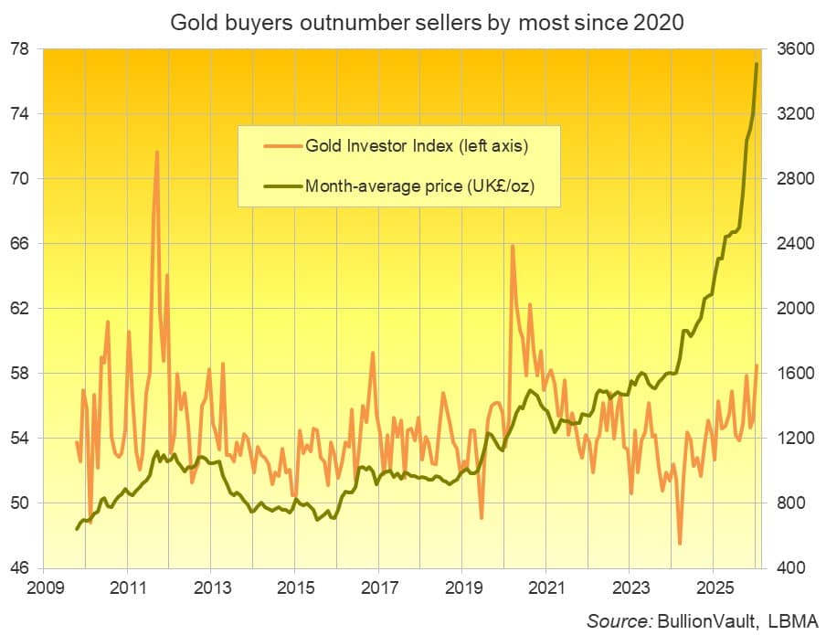 Silver had already drawn a record number of both buyers and sellers on BullionVault at the end of 2025. But those figures leapt by a further 62.9% and 85.9% respectively in January as the precious metal made its steepest month-average price rise since New Year 1980, jumping by 41.6% to £68.08 per Troy ounce.