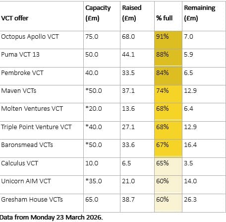 Wealth Club’s preferred VCTs for the end of the tax year include the Gresham House VCTs, the Pembroke VCT and the Octopus Apollo VCT.