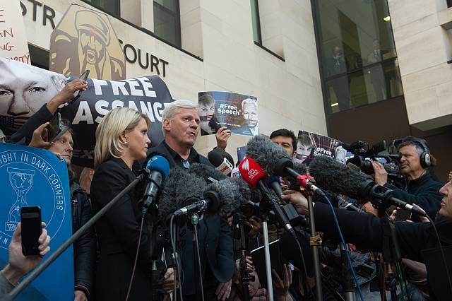 WikiLeaks’ editor-in-chief Kristinn Hrafnsson spoke to a waiting pack of reporters, photographers and camera operators she said, “Anyone who wants the press to be free should consider the implications of this case.