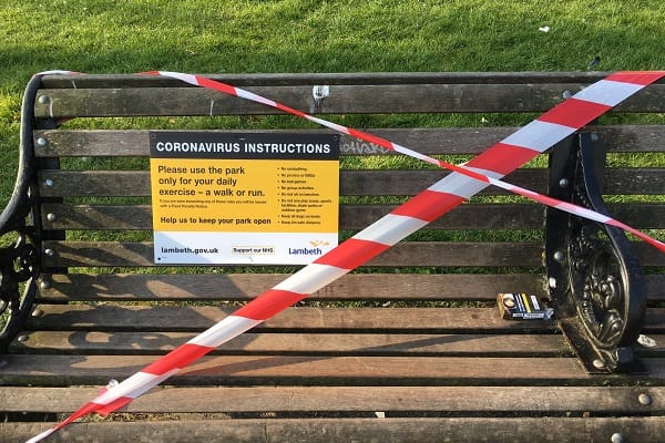 Lambeth Council have taped up park benches preventing people from sitting in Clapham Common, Southwest London as benches could “harbour” coronavirus.