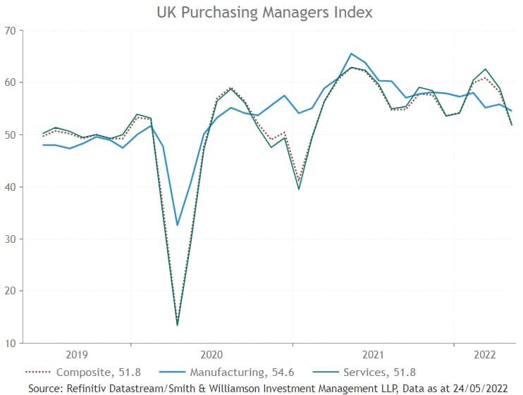The May UK composite Purchasing Managers’ Index (PMI) was lower at 51.8 (Bloomberg consensus: 56.5) from 58.2 in April. The services PMI component was 51.8 (consensus: 57.0), versus 58.9 in April, while manufacturing came in at 54.6 (consensus: 55.0), against 55.8 in April.