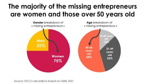 This could translate into 50% more people engaged in early-stage entrepreneurship in the EU and 40% more in OECD countries. To help close that gap, the additional barriers faced by under-represented social groups need to be addressed. About three-quarters of these “missing” entrepreneurs are women, half are over 50 years old and one-in-eight are under 30 years old.
