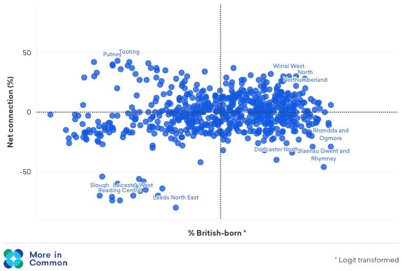 Areas with high rates of multi-ethnic households- a good proxy for inter-ethnic mixing- tend to report stronger feelings of connectedness and were less likely to have experienced unrest in summer 2024. However, where different communities live parallel but separate lives, feelings of mistrust and alienation are more common.