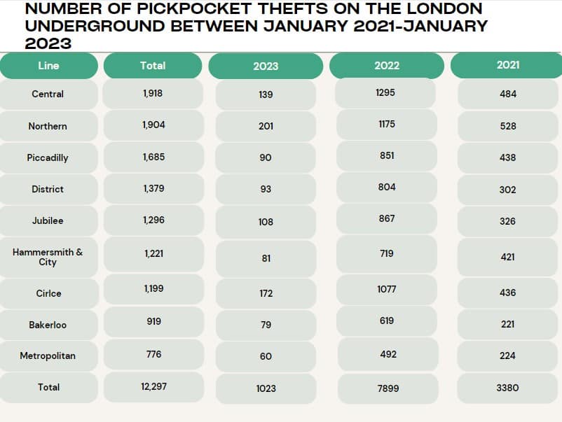 Last year, there were over 1,200 pickpocket thefts reported on the Central line, making it London’s worst-hit tube line. The Northern line ranked second, with more than 1,100 thefts.