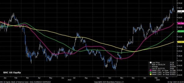 BAC trade around 10% higher in the first three months of 2024, the 4th best performing bank in the S&P 500, and a performance that is just a touch above the roughly 9% gain notched by the S&P at large