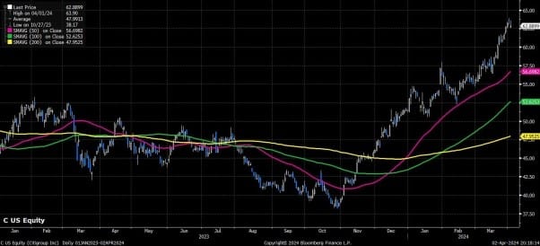 Citi trade +22.5% YTD, the best performing bank in the S&P, and within the top 50 best performers in the S&P 500 since the start of January.