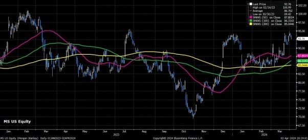 Over earnings, options currently price a move of +/- 3.25% in the 24 hours following the report, with MS having fallen significantly in the aftermath of the last 2 quarterly earnings releases – dropping 4.2% after Q4 23 figures, and 6.8% after the Q3 23 report. In fact, MS has fallen in the 24 hours following 4 of the last 7 quarterly earnings reports.