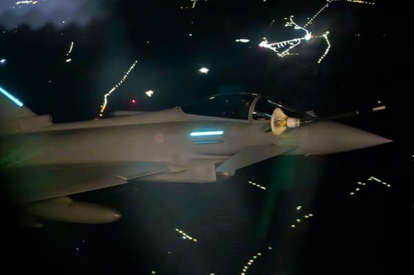 The RAF Typhoons set off from RAF Coningsby in Lincolnshire on Friday night for their defensive mission, who were given the call signs of “chaos 1-1″ and “chaos 1-2”