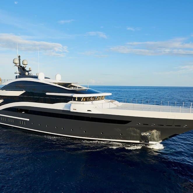 Ninety-metre DAR has luxury accommodation for 14 guests, including a private owner’s deck with a curved, rotating 6.5m sofa and a secluded terrace with a spa pool overlooking the bow. Before she was christened, her project name was Shark, which reflected the fin shape of her mast in profile and, in plain view, her wing stations replicating a hammerhead shark’s eyes. The key communal area is the main deck saloon, which boasts stunning views out to sea through 2.3 metre-high windows, while the bridge deck swimming pool is flanked by sunpads and fed by a cascading waterfall. Other star features on this Dutch-built yacht include a helipad, dive centre, hammam, sauna and submarine storage as part of a sprawling beach club. DAR is also equipped with two lifts — one for guests, surrounded by a spiral staircase, and a second that allows for discreet service by the 31-person crew.