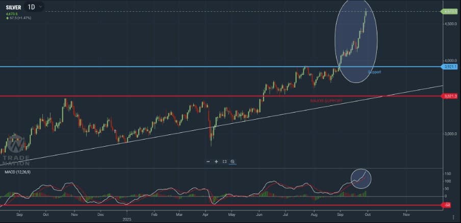 Silver has gained over 17% in September so far. But, as with gold, its daily MACD shows that it is very overbought.