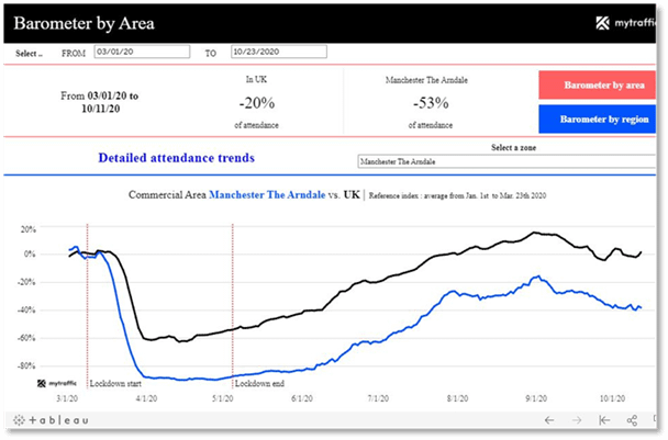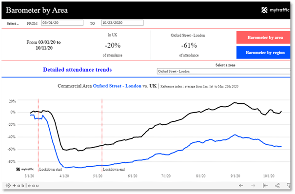 Mytraffic’s interactive barometer also closely tracks traffic trends within the UK’s top commercial zones. For example, by analysing pedestrian traffic in the London Oxford Street area, one of the UK’s busiest shopping streets, we can see a recovery of 49% of its usual daily pedestrian traffic, from a low of -86% post-lockdown in May to -37% by the end of August. Predictably, in October we can see a slight decrease once again in comparison to September, owing to new lockdown restrictions in London.