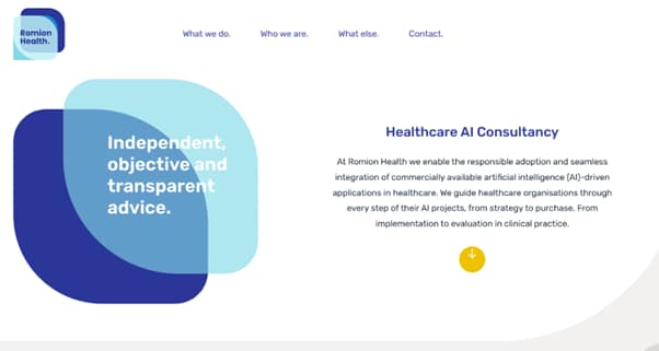 Romion Health takes a different approach as healthcare-first consultants rather than tech-first developers. Based in Utrecht, they guide medical organisations through the entire AI adoption journey with strong emphasis on clinical validation and responsible implementation. Their consultants typically work with hospitals and healthcare systems looking to responsibly integrate AI into patient care pathways.
