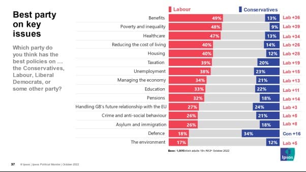 Labour also leads on a range of other policy areas, such as reducing the cost of living, taxation, poverty and inequality, healthcare, benefits and pensions, and housing, while Conservatives are seen as the party with the best policies only on defence.