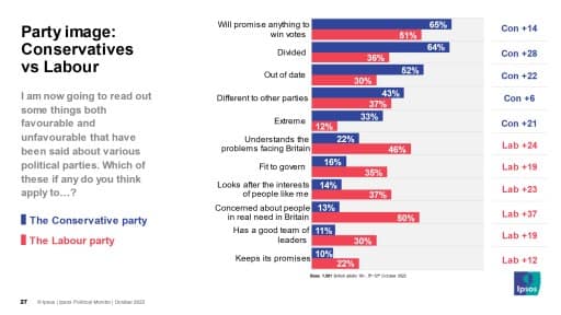 Gideon Skinner, Head of Political Research at Ipsos, said, “Over the last couple of years, the public’s image of the Conservative party has been in steady decline – particularly on issues of governing competence and empathy – and this has continued under the new Prime Minister.