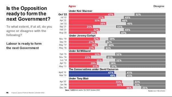 - Nearing half (47%) agree that Labour is ready to form the next government (+10 since July 2022), while one in three disagree (32%, -11). This is the highest level of agreement since Labour went into opposition (previous high was 38% in January 2022). Their numbers are comparable to those achieved by the Conservatives under David Cameron in April 2010 when 47% agreed the Conservative were ready and 41% disagreed – but behind slightly Tony Blair’s Labour in 1997 when 55% agreed, 33% disagreed.