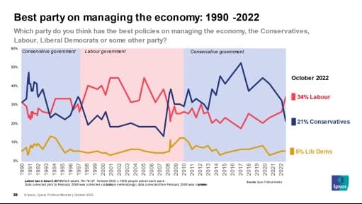 - Labour also lead on other economic policies such as reducing the cost of living (by 40% to 14%), taxation (by 39% to 20%, their biggest lead since 1995), poverty and inequality (by 48% to 9%, biggest lead since started recording this in 2015), benefits (by 49% to 13%, biggest lead since 2010), pensions (by 32% to 18%, biggest lead since 2002),and unemployment (by 38% to 23%, similar to the lead last year)[1].