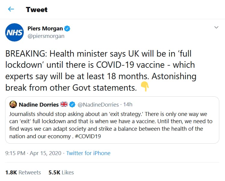 The UK’s Health Minister Nadine Dorries said the UK will remain in a “full lockdown” until a vaccine has been made, which could be up to 18 months away.