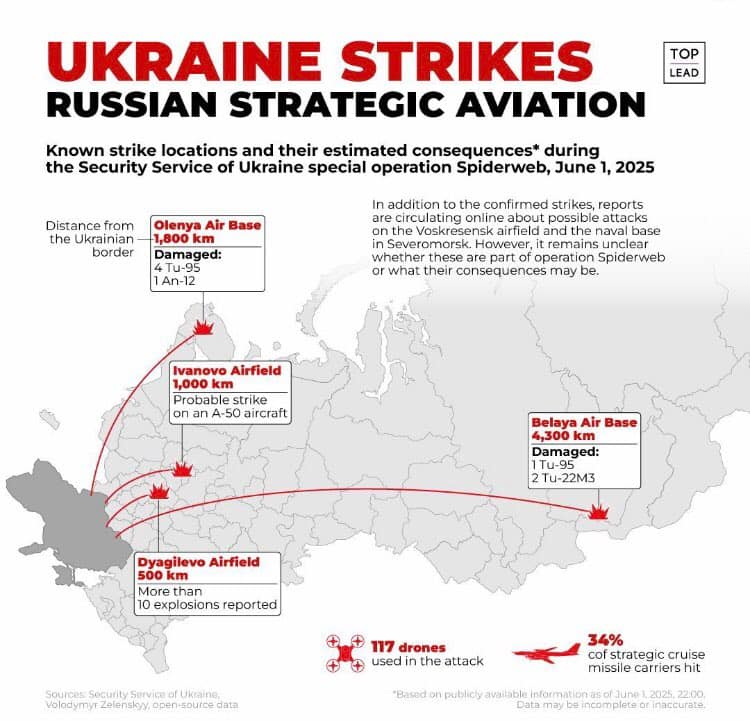 More than 40 military aircraft were destroyed including a Tu-95, Tu-22 M3 and an A-50 and 34% of Russia’s strategic cruise missile carriers were either damaged or destroyed.