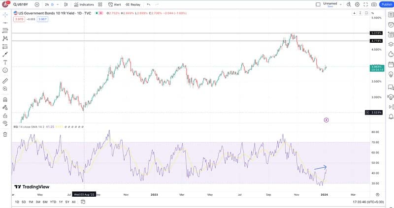 As of January 4, 2023, the US10Y chart is trading at 3.967%, up almost 12 basis points since the start of the year. And while the rates are still far off from the October 2023 high of 5.02%, the RSI’s higher highs hint at a bullish momentum.